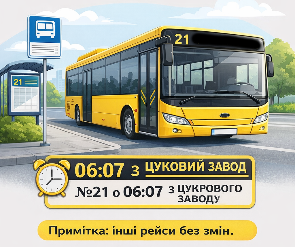 Як повідомляється в оголошенні, з 23 березня 2026 року замість маршруту №1, який вирушав о 06:17, курсуватиме маршрут №21. Новий рейс здійснюватиме виїзд о 06:07 від зупинки «Цукровий завод».